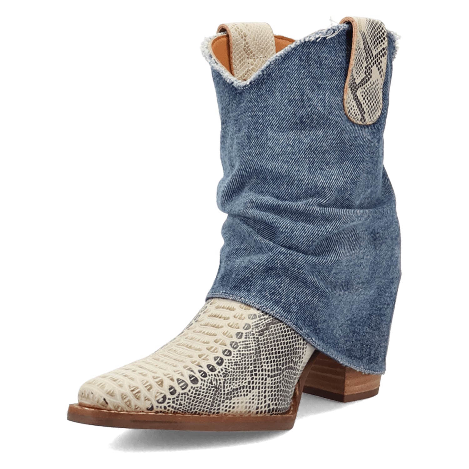 Blending the past and the present, Dingo boots stand out in the crowd. Denim Dream is where bold textures meet effortless style. With a striking snake print foot and a denim cuff overlay, this bootie offers a unique blend of fierce and chic. The sleek silhouette and unexpected design details make it the perfect statement piece for anyone looking to add a touch of edge to their look. Denim Dream is made to turn heads, one step at a time. Made from premium quality materials, these ankle boots will add a polished look to your western wardrobe.