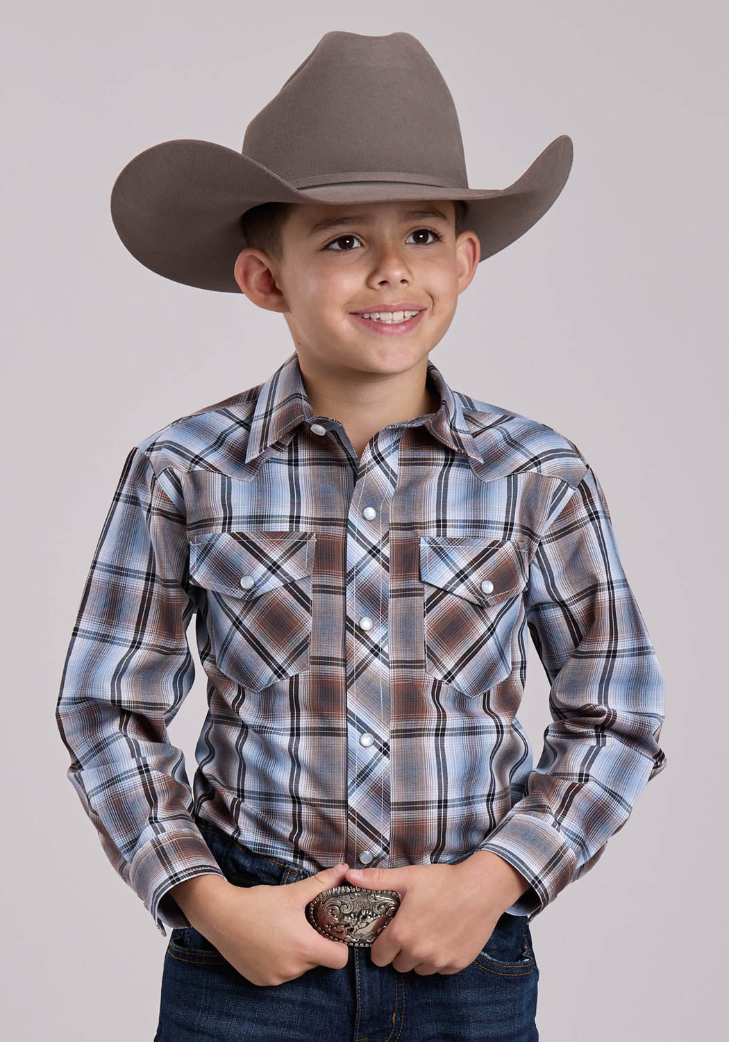 Roper Kids Boys 2906 Plaid Brown/Blue Cotton Blend L/S Shirt