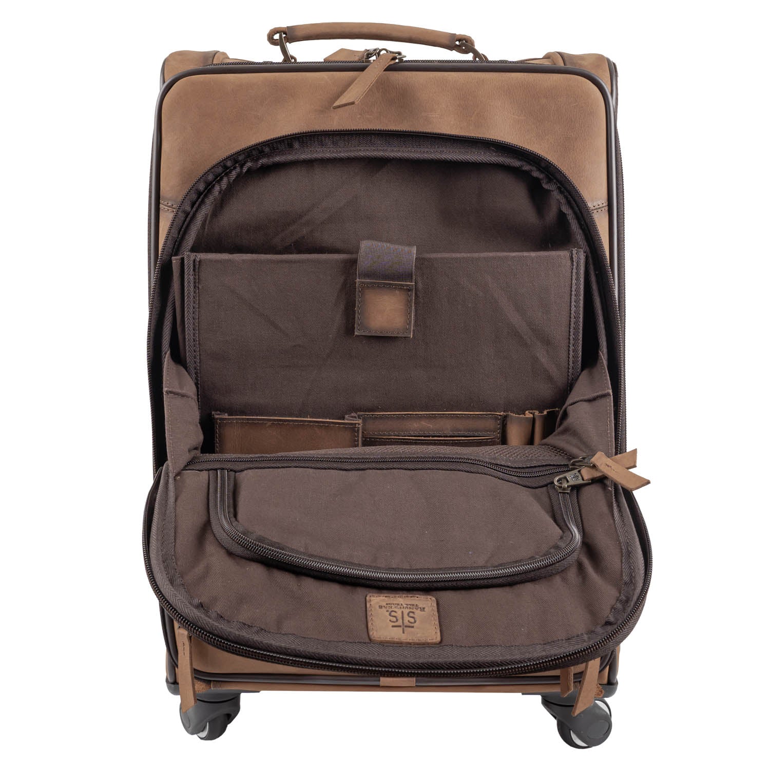 The STS Ranchwear Collection, by Carroll Original Workwear, is a collection of high quality leather apparel and accessories inspired by the ranch life. The brand values integrity, work ethic, family, and quality. This carry-on bag features cowhide/distressed full grain leather materials, 1 top leather and side leather carry handles; pullup metal bar to wheel luggage, zip around closure with sts pull and much more as listed in our bullet points below. Travel in style with timeless luggage.