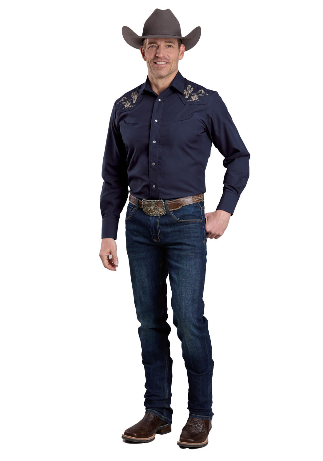 Roper Mens Cactus Desert Scene Navy Cotton Blend L/S Shirt